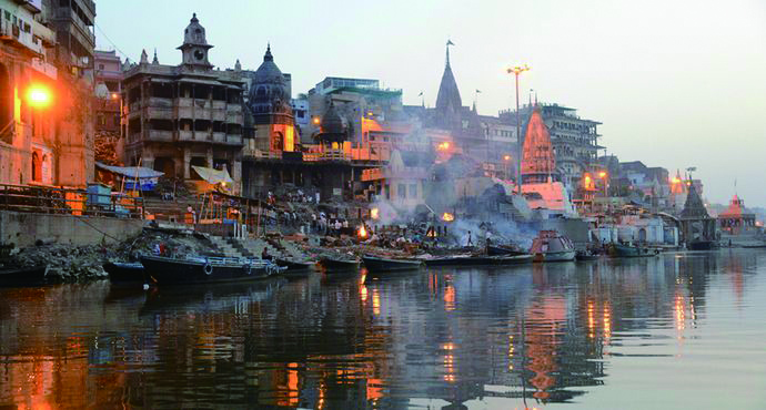 这时候,在我们右前方的岸上,出现了一群褐红色的建筑物。有圆顶的、尖顶的、柱形的,高低错杂,却又整体和谐,印度风格凸显。就是从那些楼厦前边的河坛,滚滚浓烟不断地升起,又飘荡开去,与河面的水汽混合,成为罩下来的雾帐或者雾障。