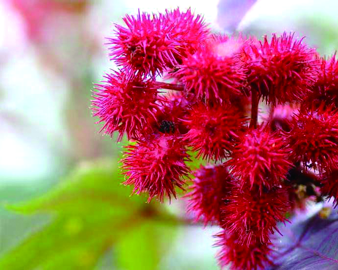 下雨的时候,钻到伞一样的蓖麻叶下面,听雨哔哔叭叭地打在叶子上。五六岁的小人儿,尚不知道雨打芭蕉的意境,调皮地折下叶子接雨,在地上划沟,引导水流向低处。蓖麻花有红有黄,花蕾像小包子,蓖麻子长着刺,像刺猬。起初,包裹蓖麻子的刺软乎乎的,等变了颜色,就有点扎手了。