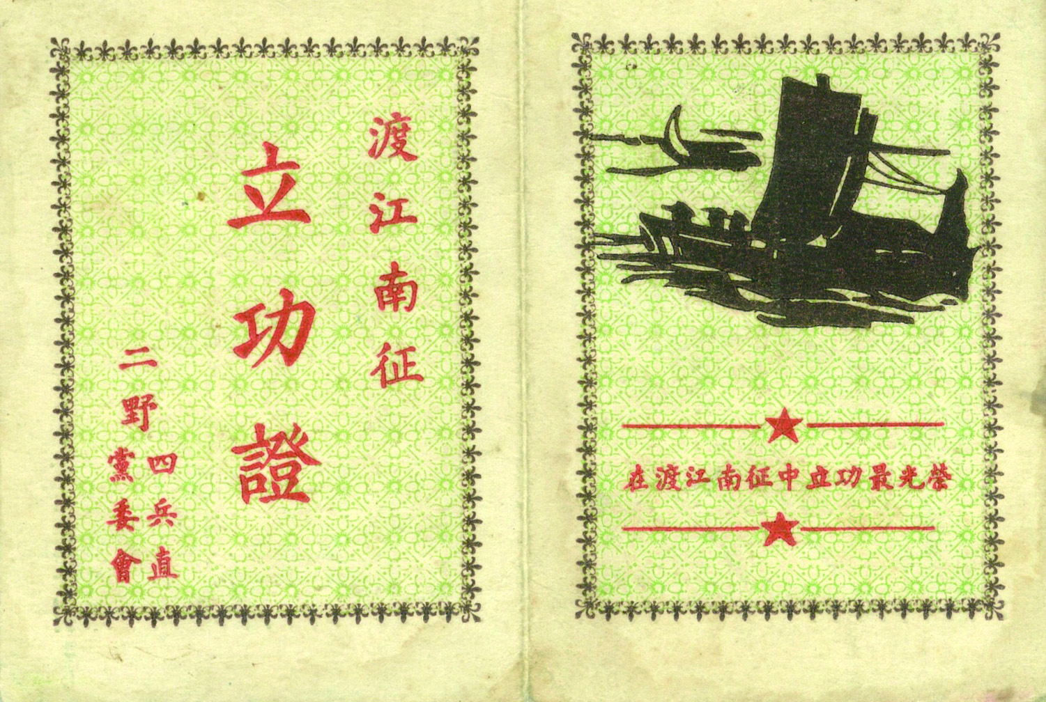 一个多月后,四兵团前进到鹰潭休整。在总结大会上,父亲得知,他所在的那艘船是第一个登上长江对岸的,被命名为四兵团渡江第一船,我父亲和船上所有突击队员都被授予渡江南征战役特等功。随后四兵团暂归第四野战军领导,部队向南,大穿插大包围,以大钳形攻势歼灭衡阳宝庆白崇禧主力。1949年10月1日,新中国成立之时,我父亲所在部队正向广州挺进。10月19日,四野十五兵团和二野四兵团联合作战解放广州。之后,刘伯承、邓小平命令四兵团向贵州云南进军。