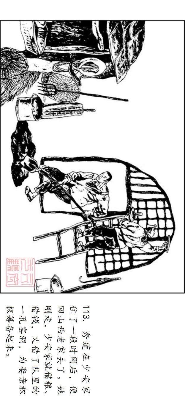 通过长期改编的创作经历,李志武深觉长篇作品对绘者的吸引力,舒展的篇幅和内容给予绘者充分展开的想象空间,并呼唤他们运用图像语言不断攀上艺术阶梯。改编上述三部当代文学名著时,李志武为突破传统连环画的视觉影响,引入了“分镜”技法,在图像语言的转化上有所突破。在不同的时空背景下,如何表现人物的形象、性格,心理变化等都在探索之列。起初改编《平凡的世界》和《白鹿原》,李志武仍采用传统连环画的方法,先写好脚本,再完成绘画的创作,但这种做法让他深切感到脚本创作过程中,画家进入得不够,创作对原作的理解不充分,效果也不尽如人意。因此,在创作法文版《秦腔》时,他尝试变换创作方法,从改编脚本环节便开始介入。法文版图像小说《秦腔》率先完成了绘画,文字则后续根据绘画的需求衔接。
