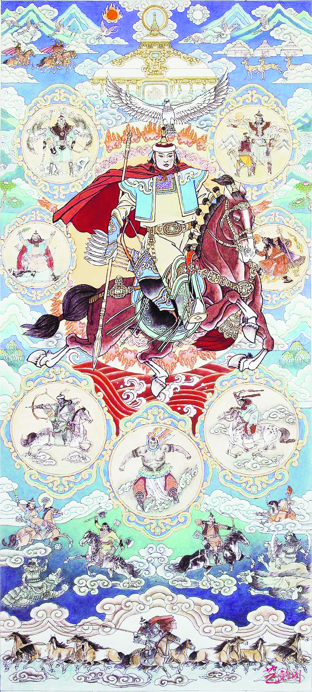 如果说江格尔、洪古尔等英雄是人性和神性的统一体,蟒古思是人性和兽性的统一体,那么《江格尔》中的骏马就是将兽性、人性和神性融为一体的艺术形象。当英雄诞生时,命中注定有一匹骏马将为他出世,并将与他出生入死,风里雨里,相随一生,不离不弃。对英雄而言,骏马是他的同胞,是他的战友,是他的知己。他们朝夕相对,推心置腹,全情托付。骏马像守护神一样日夜陪伴英雄,为英雄出谋划策,为英雄全力以赴。英雄和骏马将心气与志气完全地超常地张扬迸发,创造性地在广阔的草原吟唱出了神圣而崇高的叙事,奠定了草原英雄史诗的主旋律和草原文明的基调。