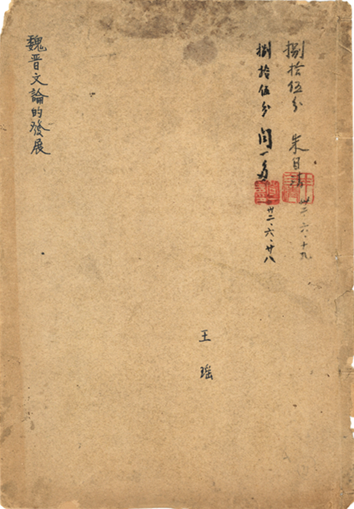 王瑶学位论文《魏晋文论的发展》封面,有朱自清、闻一多的打分