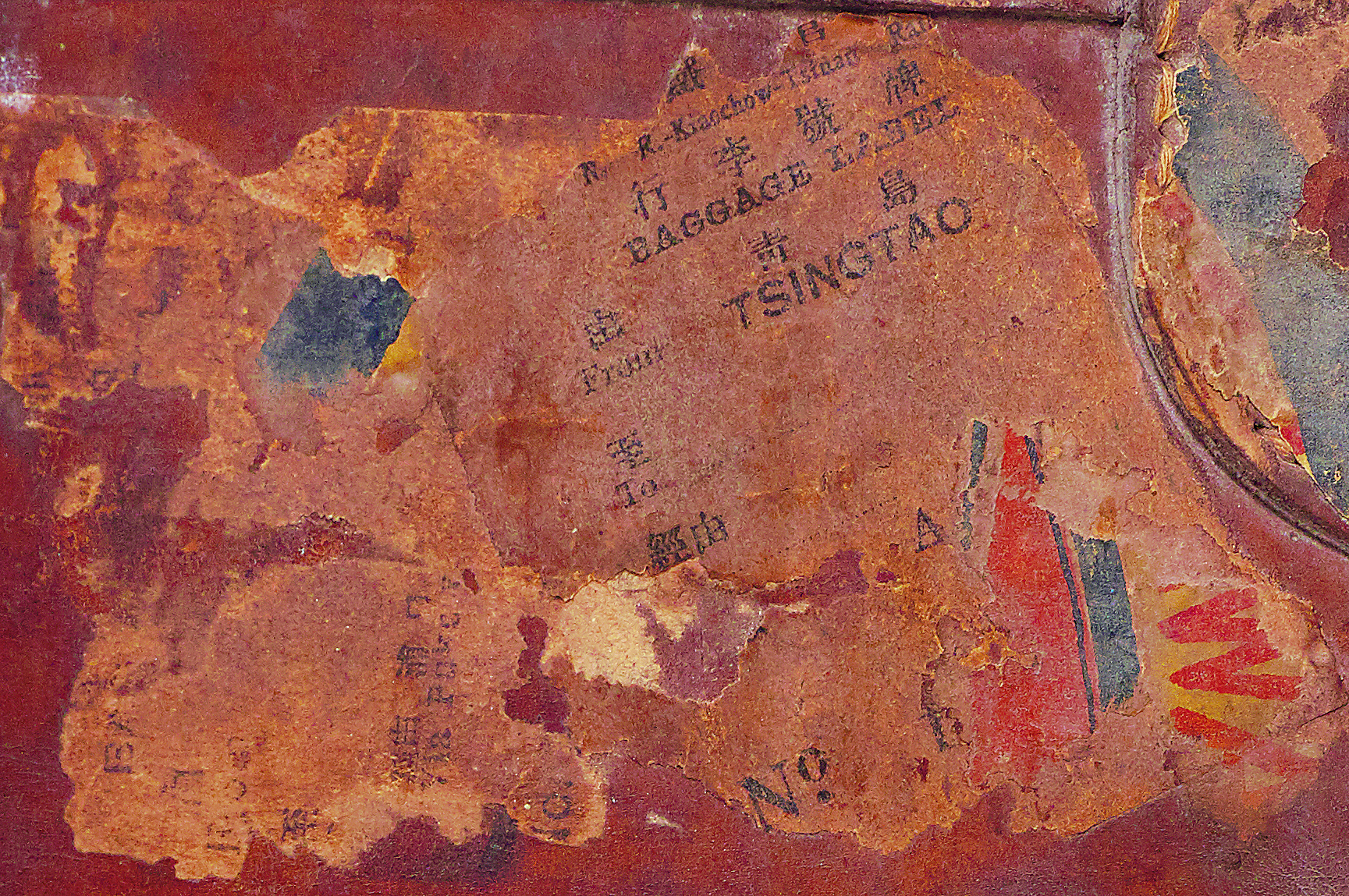 皮箱侧面局部放大可见“BAGGAGE LABEL”,“由”(from)和“青岛”(TSINGTAO)字迹