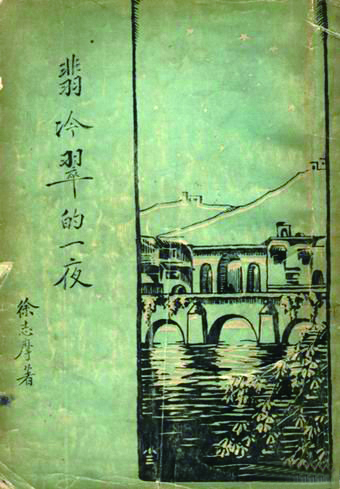 新月书店(上海望平街161号)1927年9月初版,分甲种和乙种本,正文共140页,收诗52首。甲种本纸张厚实,页面稍糙,定价6.5角;乙种本纸张稍薄,页面光滑,定价5.5角。这两种版本,唐弢都有收藏,皆为毛边本。封面左侧題有“翡冷翠的一夜 徐志摩著”,右侧为江小鹣画作,内容为翡冷翠维基乌大桥风景——天上繁星点点,远处城墙绵延,近处波光微漾,眼前枝叶浮水。画面空间感很强,也别具美感。