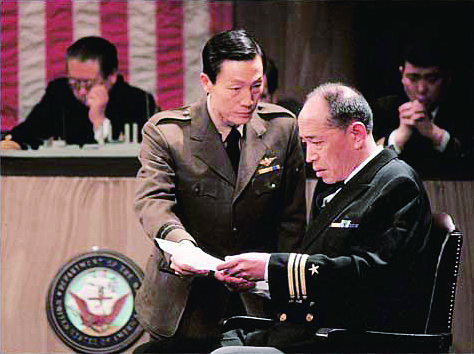 第三,音乐性。说台词也像唱歌一样,也要有换气、渐强、渐弱等节奏。咱们剧院很多老演员都有这个功夫。特别是舒绣文,她的台词本总是标注得密密麻麻,哪些地方是连在一起说的,哪些地方需要断开,哪些地方是气口,哪些地方渐强、渐弱,全都标注得清清楚楚,平时不断地练。等真到了舞台上,还要把这些忘掉,把准备的技术放到下意识里。这跟焦菊隐先生提出的表演的中国学派有关系,中国的表演体系讲究这个“技术性”。举一段《哗变》中魁格的台词,当律师格林渥拿出作为证据写满魁格平时劣迹的小本时,魁格气得脸色发白,他说:“我当然看过这个精彩的文件了,我都看了,(憋着一口气把下面的台词一气说完)这一辈子我还没见过这么处心积虑把谎言捏造似是而非的流言蜚语凑到一块的大杂烩。”这么多字,非得一口气说完才感觉对劲儿,才能反映出人物当时的情绪。所以演员说之前要把气攒足,像这些地方都得精心安排,这需要技术。再比如说对凯恩号的描述:凯恩号实际上是第一次世界大战中遗留下来的那种平甲板的驱逐舰。只有一个“平”字闭上嘴了,其他字的发音全闭不上嘴。这样演员念得很不上口,但这种情况演员只好练。咱们的相声、绕口令,练的就是这些。再比如京剧名家马连良唱的《甘露寺》中的一段,“在古城曾斩过老蔡阳的头。”这里的“城”和“曾”连在一起,在舞台上同时出现是犯忌讳的,但马连良处理得非常漂亮,几乎成为经典。这是演员要下功夫的。我们戏校的科班孩子,从入学起就每天背诵“尖团字,湖广音”这样的发音训条,从小就下功夫。现在的演员不琢磨这些,如果不加以重视,就这样糊里糊涂地混过去,那真是变成了会说话的都能演戏了。因为舞台剧不像看书,不能翻过头来再看一次,没听清就过去了,对观众是一种遗憾,对演员自己更是一种遗憾。广播说唱团的团长白凤鸣②说过:“演员台词不清楚等于锯观众的耳朵。”所以要特别重视这方面的问题,否则对不起观众。