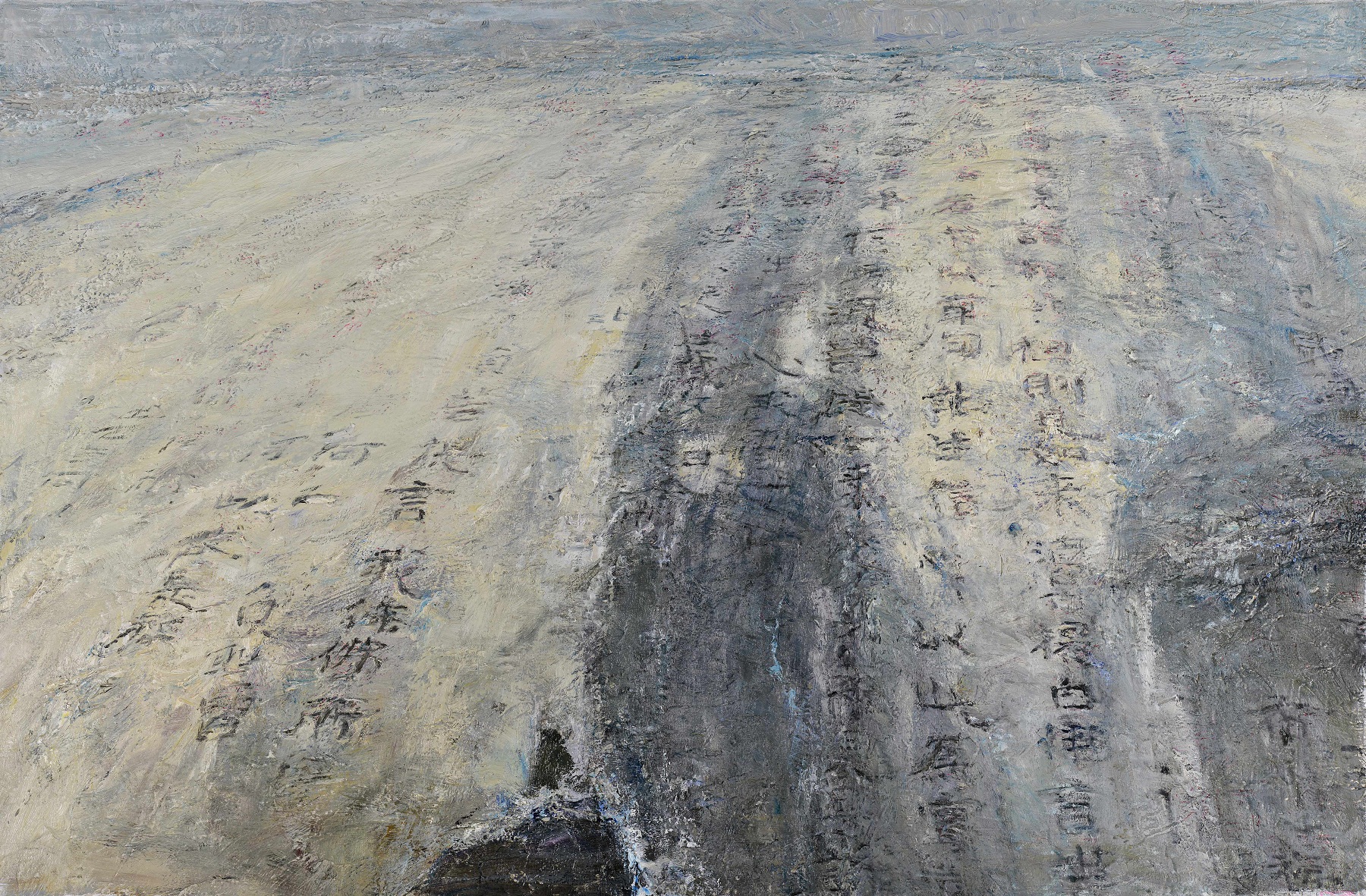 钟涵曾无数次风尘仆仆深入黄土高原地区,把心血倾注在滚滚黄河、纤夫之路上,他浑厚而质朴的画面中不仅流露出富有诗人气质的哲思,更体现出其精研中西文化之后对油画本土精神作出的追求。钟涵的作品大多表现人与自然的艰苦关系,从此次展览所展出的新疆和河南写生系列、黄河系列作品中,可以看出艺术家用凝重的笔触和浓重的色彩,表现人与黄土高原、人与黄河等自然艰苦环境拼搏抗争的精神,表现人类坚强不屈的悲壮气概。在他的作品里,一切形体融化在神秘莫测的形相氛围之中,借助风、云、烟、火等不可触摸的形状增强笔触在画面的运动感,创造浑然一体的视觉撼动,其浓黑厚重的画面中,常常以些许跳跃的亮色导引观者之眼,于其构图的整体上下文中去读解具体的形式。在钟涵的作品中,还有一个系列是现代中国油画画坛上少见的,即以古代碑刻文字入画的作品,展现出艺术家深厚的文史素养和人文精神。该系列作品共5件,分别是《碑林》《后土轻羽》《白鹤梁》《沙尘暴之履涉》《泰山经石峪》,也在本次展览中亮相。