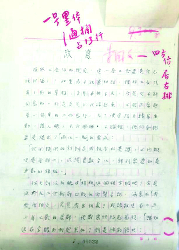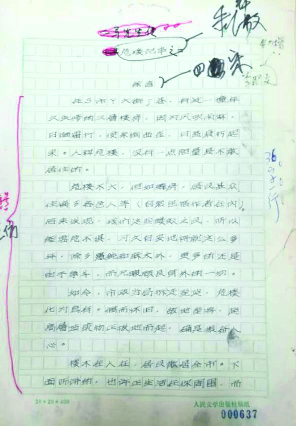 《危楼记事之二》手稿54页,作者用蓝墨钢笔书写于“20×20”“人民文学出版社稿纸”上,字体横平竖直,方正工整,仿佛在刻蜡版;从表面看,整部手稿除偶有编辑用朱笔修改的痕迹外,没有任何字迹的修改。再仔细查看,手稿每页都作了修改,少则二三处,多则十几处。因作者不作涂改,而是裁剪相同大小的稿纸,写上正确的字粘贴在错字上。因格线对得齐整,不能一下发现其中的“秘密”。作者这种细致认真、精益求精的“工匠精神”,令人敬佩、叹服。