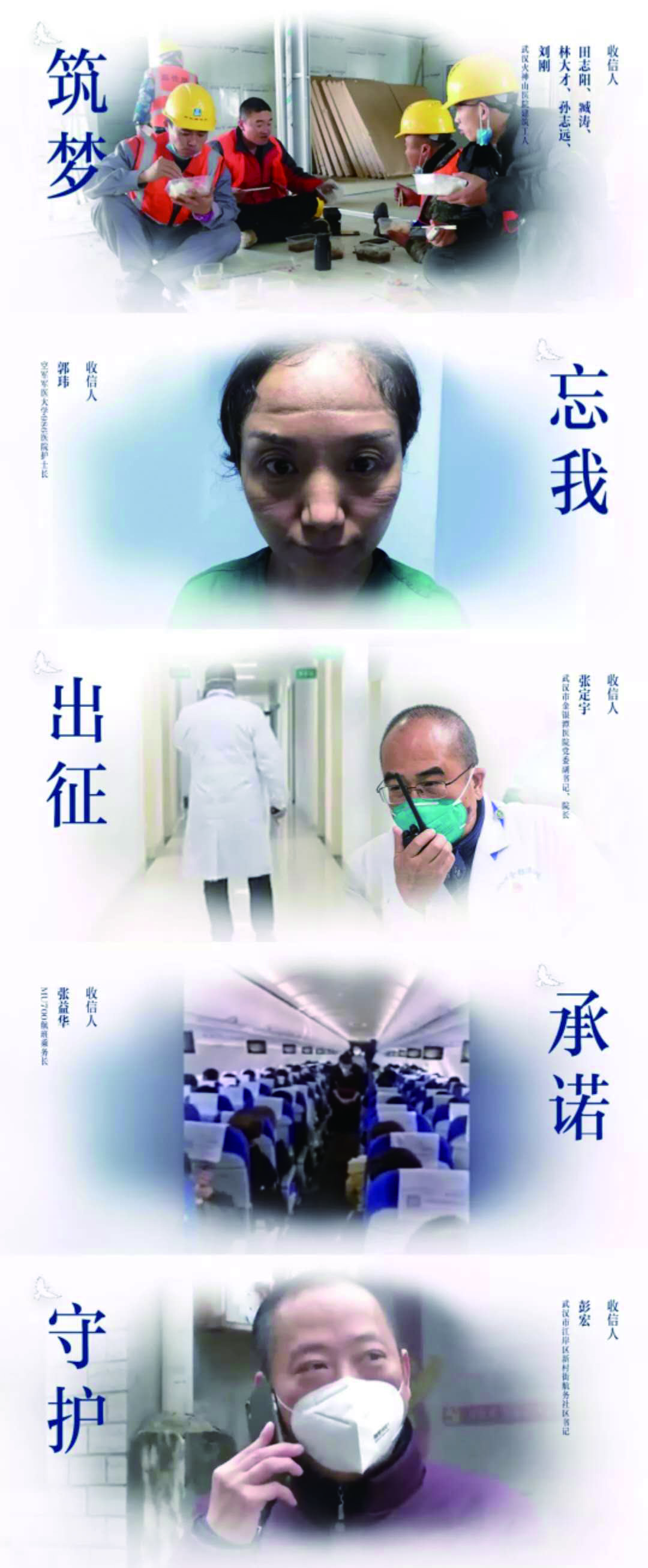 面对顽固的疫情,广大文艺工作者积极行动,用各种各样的文艺形式宣传防控知识,讴歌感人事迹,为打赢防控阻击战凝聚力量,彰显了各自行业的集体精神。节目《两地书》正是借用视听传媒的特殊表现形式,通过影视演员为抗疫前线的英雄写信(读信)的方式,树立起影视界的集体意识和家国情怀。“一封来自电影人最温暖有力的信,对应一个发生在抗疫期间的动人故事”,这让疫区的同胞坚信,他们并非在孤军奋战,而是有一个更为强大的集体在背后关注和支持着他们。节目中所建构的这个集体,表面上看,似乎是一种个体对个体的单线行为,实际上通过媒体的传播,明星的效应,形成了“大音希声、大象无形”的审美效果和社会效应,使得全民同声相应、并肩作战的凝聚力更加深邃而宏远。另外,短视频节目还制作了后续的人物反馈,使这个集体的凝聚力和向心力更加牢固、强大。诸如第一期节目《筑梦》播出后,栏目组又不失时机地做了一期人物回访。观众可以看到,演员郭晓东、主持人蓝羽和几位建筑工人在电视中同一画面的分屏显示,无疑让之前建构的广大和深厚的集体关系更为牢固。在抗击疫情的过程中,正是这些军人、科学家、医生等等最可爱的人用热血和生命谱写了“众志成城”的壮歌。在这些集体中,画家们拿起画笔,用线条和色彩讴歌白衣天使们临危不惧的品格;音乐家们创作了一首首抗疫歌曲,用旋律唱响中国精神;作家们以“笔”为枪与全国人民一起共战疫情。文艺界不同形式的创作,显示了这种集体精神强大的爆发力和凝聚力,反映了新时代文艺家和祖国人民同呼吸、共命运的担当奉献品格。