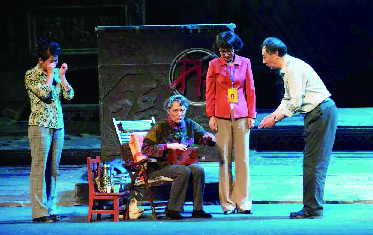 我在排演内蒙古自治区话剧团演出的《北梁人家》时,即遇到了相近的问题。剧本描写的是包头市城中村某院落将被改造,老住户们由于搬迁问题,将几十年来隐藏的矛盾和困境都表现成为冲突。编剧将该剧的焦点聚集在这个院落的几户人家中,而且用写实手法表现这些人物和具有怀旧意义的院落。但是,剧中会轮番出现这几户人家的内景戏。如果几分钟换一次景,将会破坏编剧一气呵成的剧情和人物关系,而且在舞美和导演技术环节上也很难完成大规模的写实环境布景在同一幕戏中的多次迁换。通常舞美设计遇到类似剧本情况时,不使用写实手法来表达也是有效的。但是这个作品着意表现逼仄的老包头院落环境,着意表现具有200多年历史的老院子面临拆迁时人们难以割舍的情感。此剧采用历史存留细节和有鲜明地域特点的建筑结构,是导演与舞台美术设计唯一有效的选择。为了完成编剧的这个构思,我与舞台美术设计很费了一番周折,终于找到巧妙的方案,实现了既保持老院子写实的细节而又不必频繁地迁换。我们将老院子的总体建筑格局和各家的门窗等建筑,变成平面的地面处理,也就是将院墙大门、各家的窗棂倒伏在地面,成为舞台地面的浮雕装饰。而将院子中的台阶、影壁、房顶烟筒做出体积上的变异,成为舞台的表演支点。在舞台后区,悬吊一块70多平米的镜面,将舞台地面的建筑反射到镜面上,使观众能够在局促的舞台上,看见编剧所希望表达的老院子的诸多细节,而又能够流畅自然地欣赏到各家空间中发生的情节。