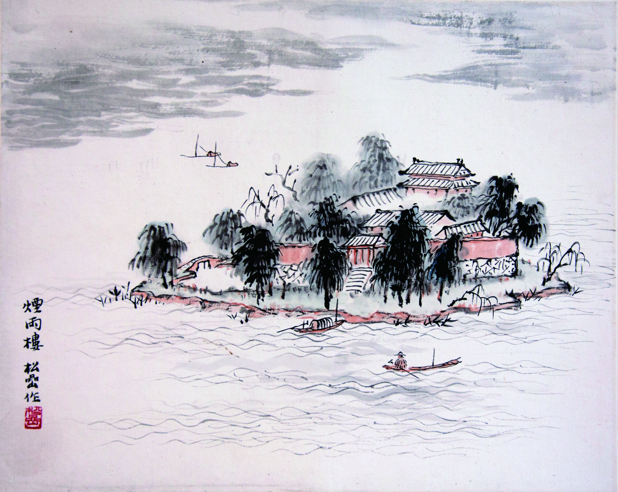 1961年,钱松嵒表现的烟雨楼正如同《乾隆南巡图》中的烟雨楼一样,是平常所见的名胜,也就是普通山水画,或山水画中的一边一角。作为画面的主体以非常完整的画面构图显现出了传统笔墨的神韵,用笔精简,小中见大,表现出了烟雨楼不同一般的特别气韵。将其与此前江苏画家旅行写生中余彤甫的南湖写生相比,可以看到上世纪50年代后期和60年代初所出现的变化和画面的不同。在此后不断发展的过程中,以烟雨楼所构成的湖心岛这一景象的变化,在钱松嵒1957所画烟雨楼上并没有那条纪念船,和《乾隆南巡图》的景象相当,近景的岸边也是打鱼的渔船,行走在湖面上的也是渔船。所以,这个时候虽然都是画的南湖和烟雨楼,钱松嵒这个时期同样所面对的都是中共一大会址,在表现上却有了很大的不同。这个不同是因为有了纪念船,有了属于一大会址的那条船,而更重要的是因为社会对于这一历史的新的认识,以及社会对于艺术的新的要求。此后,钱松嵒多次画南湖,纪念船却成了主体。同样是杨柳依依和杨柳掩映,画面中景或突出地位上却是那条纪念船。而纪念船同样是静谧地栖息在水面上,却表现出了钱松嵒的新山水的样式,这是新时代的风格和追求,再也不是旧文人表现山水的格局和气度,更不是旧文人画所表现的传统山水的笔墨。这是一个时代的巨大变化,也是一个时代中画面格局和意境的变化。