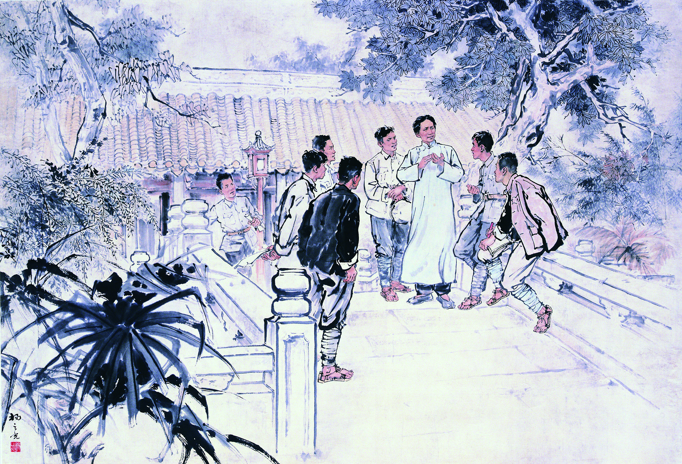 还有杨之光1959年创作的《毛泽东同志在农民运动讲习所》,共有6个版本,从刚开始的横构图到后来的竖构图,经历了不同的时间,其间近10年,杨之光不断在画同一题材。1959年的版本用传统的笔墨塑造毛泽东的形象,非常自然,画面人物之间有着非常生动的组合关系,毛泽东与农民运动讲习所的学员之间也是非常的随和,这里只看到一位教员和学生的关系,而不是领袖和群众的关系。在农民运动讲习所的场地、环境的渲染等方面,都在传统中国画的范围之内有着很好的表现。1971年的版本中出现了红旗,而且人物画得很红,是典型的“红光亮”的产物。1972年版本就不是一般意义上的老师和学员之间的关系问题,已经开始出现了领袖和群众之间的关系。这个时候毛泽东和他的学员们行走在上桥的坡路上,而不是停留在桥上交流、交谈。因此,这个时候的变化实际上已经表现出了上世纪70年代的社会氛围对主题绘画创作新的要求。到了1976年的版本,依然是行走在桥的上坡路上,但是,画面改成了竖构图,其与横构图相比,是树可以画得更高,毛泽东的形象则更加伟岸,这就是现实中对于表现领袖人物创作的变化。而这个时候农民运动讲习所的农民已经不是普通的农民,而是中国共产党领导的一支农民的武装力量。画面中的他们拿起武器,而且还出现了士兵的形象。这种主体形象发生的变化,实际上也让人们看到了在一个历史时期之内如何来看待农民运动讲习所的问题。而画家笔下的农民运动讲习所在历史的发展过程中也表现出了不断的变化。从1959年到1976年这十多年的时间之内,画家在《毛泽东同志在农民运动讲习所》这一画稿的基础上六易其稿,这里面有着巨大的变化,反映的是从1959年之后在一个特别的历史时期之内所显现出的变化。