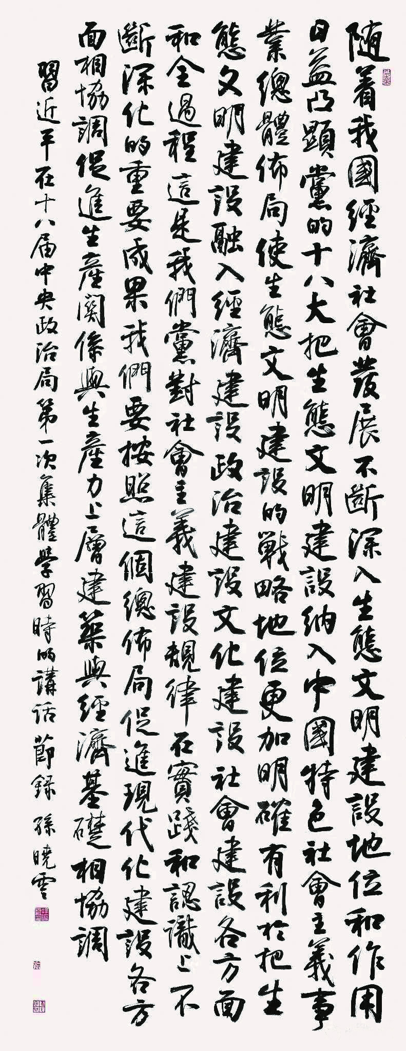 中国书协主席孙晓云在致辞中谈到,为深入学习贯彻习近平总书记关于学习中共党史、新中国史、改革开放史、社会主义发展史系列重要论述,书写中国共产党的伟大贡献和重大成就,回顾中国共产党人为中国人民谋幸福、为中华民族谋复兴的初心使命,中国文联、中国书协从当前实际出发,引导书家学史明志、撰文记史、濡墨抒情。书法艺术不仅仅是书斋里的陶然自乐,也要因时而书、因事而为、因人而作。在中国人民追逐梦想的伟大实践中激发灵感,在新时代蓬勃向上的生活中获得素材,在对人民真挚持久、发自内心的热爱中坚定自信,努力创作出有生活、有情感、有风骨、有魅力的书法作品。功用与艺术齐驱,文章与翰墨相映。