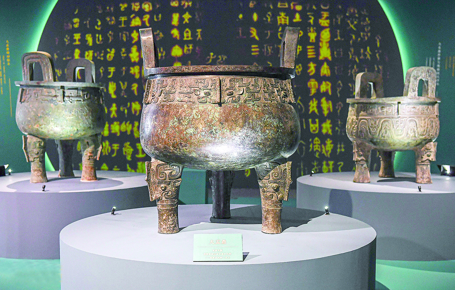 展览中,国家博物馆收藏的子龙鼎、大盂鼎与来自上海博物馆的大克鼎联袂亮相。这三件鼎是中国古代青铜鼎中的经典之作,承载着中华早期文明的灿烂成就,它们在近代出土、保护、流失和归藏的颠沛命运,也充分见证了中华民族走向复兴的光辉历程。考其体量与内涵,可称“圆鼎之尊”。该种规格的青铜器鲜有机会在单一展览中共同亮相,此次三尊重器齐聚一堂,殊为难得。(黎华/文 余冠辰/摄)
