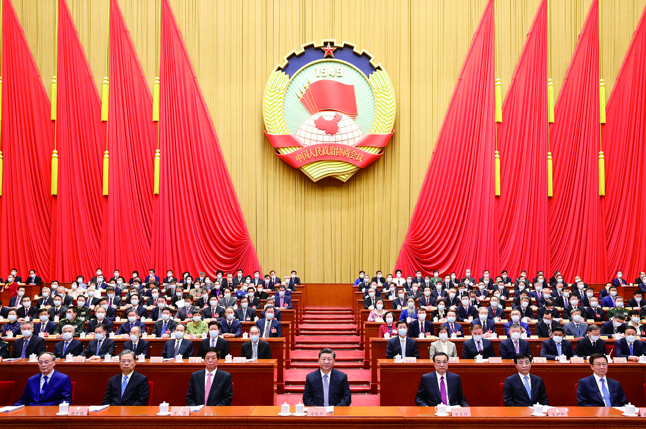 3月4日,中国人民政治协商会议第十三届全国委员会第五次会议在北京人民大会堂开幕。这是习近平、李克强、栗战书、王沪宁、赵乐际、韩正、王岐山在主席台就座,汪洋代表政协第十三届全国委员会常务委员会向大会报告工作。 新华社记者 黄敬文 摄