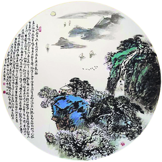 中国山水画历来以诗一样的意境寄托着人们对大自然的情怀,使中国传统的“仁者乐山,智者乐水”“师法自然”“天人合一”的人文思想得到体现。山水画家衣惠春深谙此理。他的许多作品多为大画、长卷。尤其是一批浸染了中国文坛巨子诗词歌赋的意境的作品中,可以清楚地看到他的艺术特色。《大江东去》中的群峰起伏、江水奔流,《滕王高阁图》中的清丽色调与浩渺烟波,《天姥山梦游图》中梦幻般的山与海,《春江花月夜》中的“海上明月共潮生”等,都在不同的立意中或泼墨泼彩,或轻描淡写,或机理与笔墨同在,或青绿重色层层晕染,使作品不凡的立意得到了艺术的生动再现。