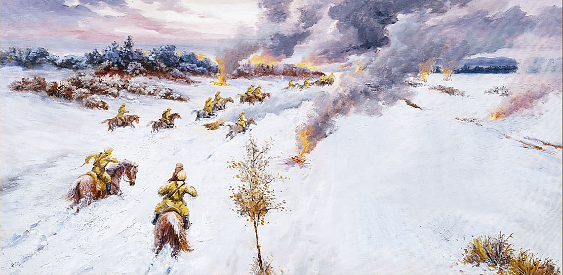 要说到绘本之“绘”,它的图画自然也非常重要。《父亲的战马》中的图画不是插图或配图,其本身就是话语的一部分,它与文字共同诉说着一个故事,保证故事叙事的完整性。绘本中图画的呈现是灵活的,它既是满格的,又有着局部的特写,它与文字的角度有时是同一的,有时又是互为补充的。它以绘画语言的特殊性满足了孩子形象的认知,又激发了孩子们空间、场景与氛围的想象力。《父亲的战马》的绘画是现实主义风格的油画,它的写实、深沉、庄重,非常切合作品主题。画家牛春光此前就与鲍尔吉·原野有过合作,对草原文学有深切的理解和认同,所以,才有了《父亲的战马》中文字与绘画富于张力的对话关系。