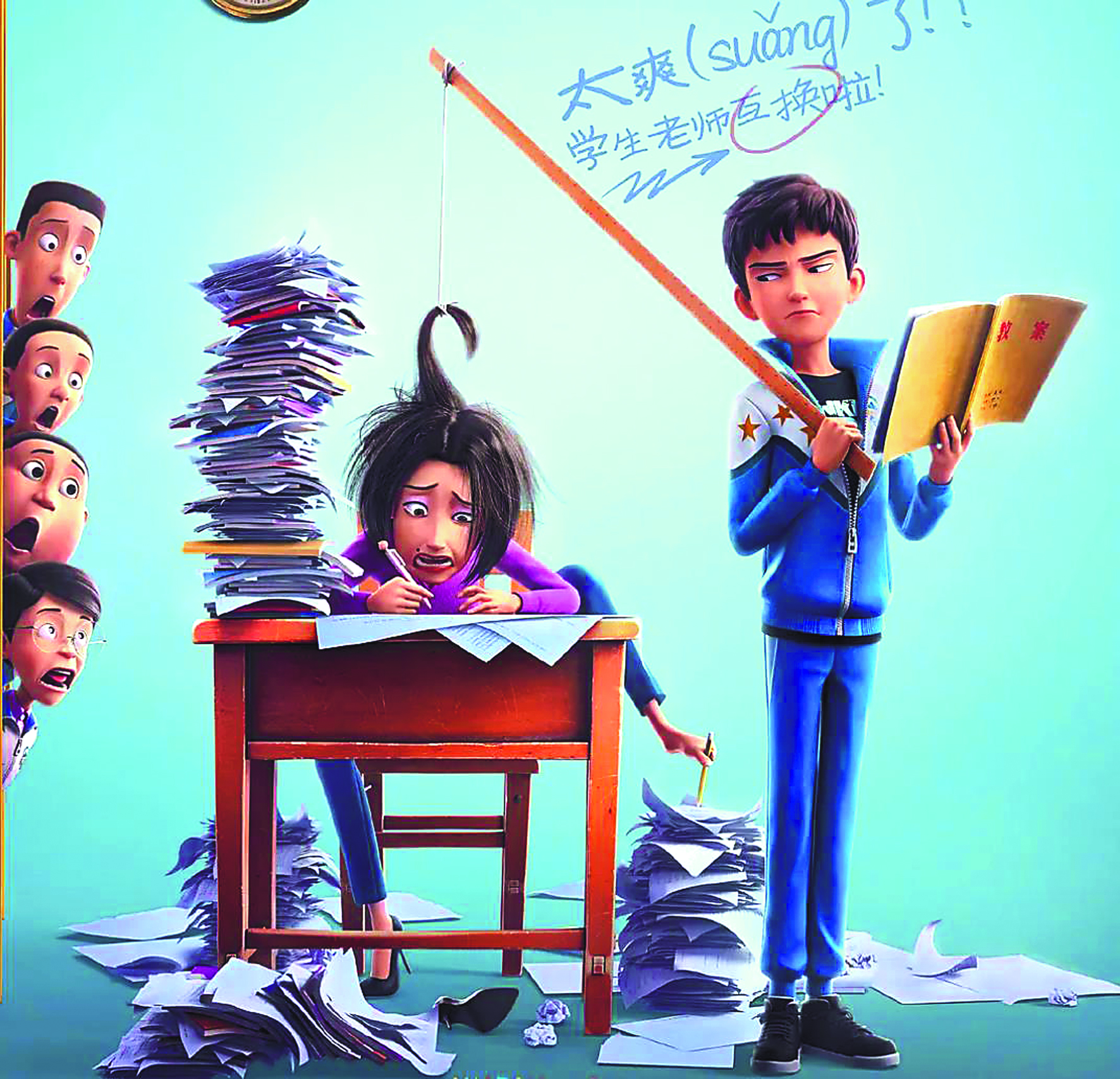 人物上,影片人物性格鲜明得近乎“刻板”,且十分“接地气”。由于没有反派人物,矛盾往往由于身份的差异产生。老师认真负责,对学生严加管教,因而显得强横霸道,学生有莽撞调皮的性格,有无拘无束的天性,有贪玩好斗的任性,天然地将管教他们的老师视为“敌人”。在二者的角力中,学生们调皮、倔强、不服输等特征活灵活现,小聪明也足以让人会心一笑。而无论是班主任老师还是校长,除了强硬的外表下对学生的尊重与爱护,爱撸串、玩游戏、爱开会絮叨的另一面也展露无遗,身份与身份认知不匹配制造了喜剧效果。