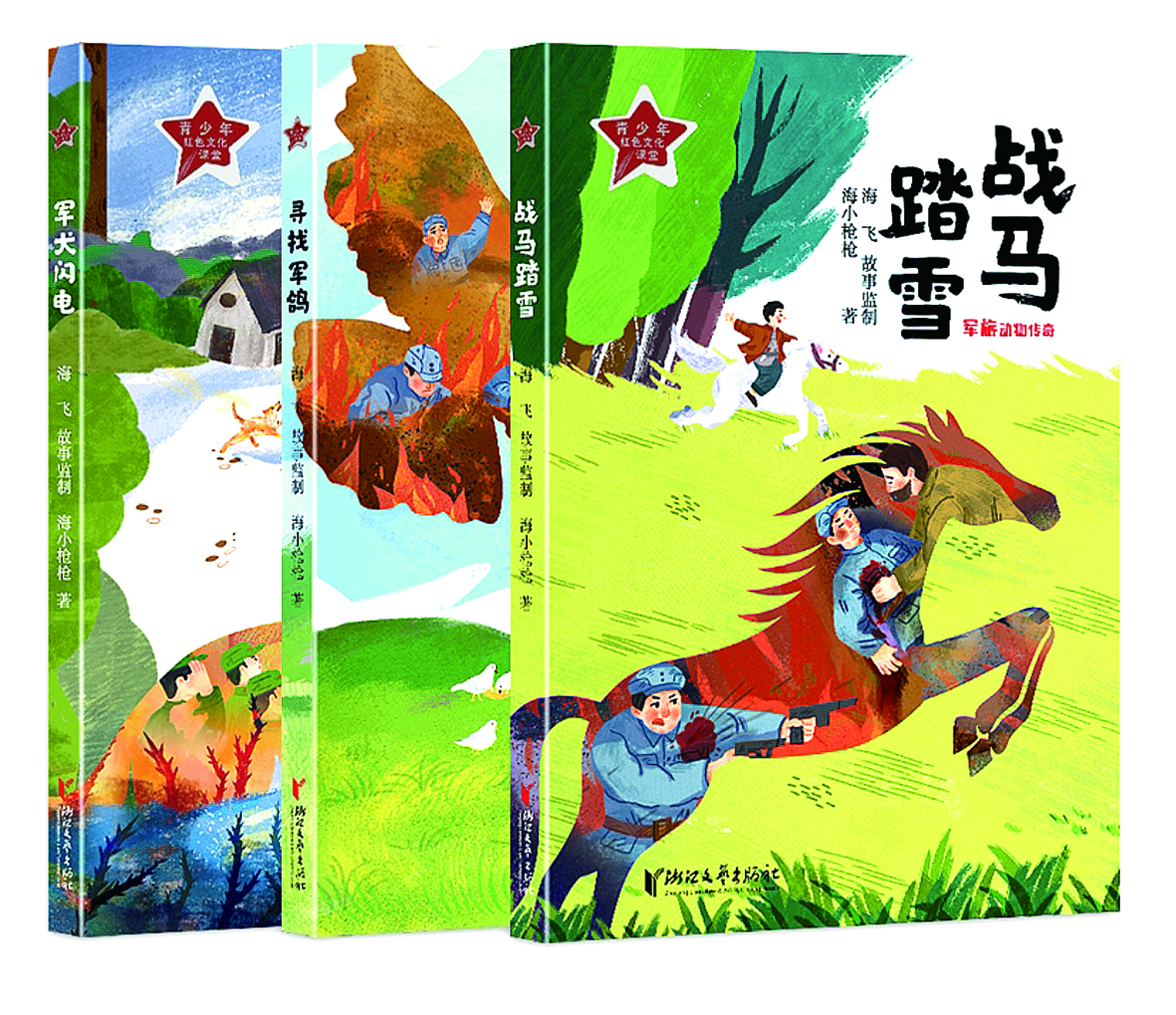 在海小枪枪“军旅动物传奇”系列儿童小说作品中,作者着眼于孩子与动物之间的深厚情谊,以抗战作为背景,创作了《战马踏雪》《寻找军鸽》《军犬闪电》等几部儿童文学作品。