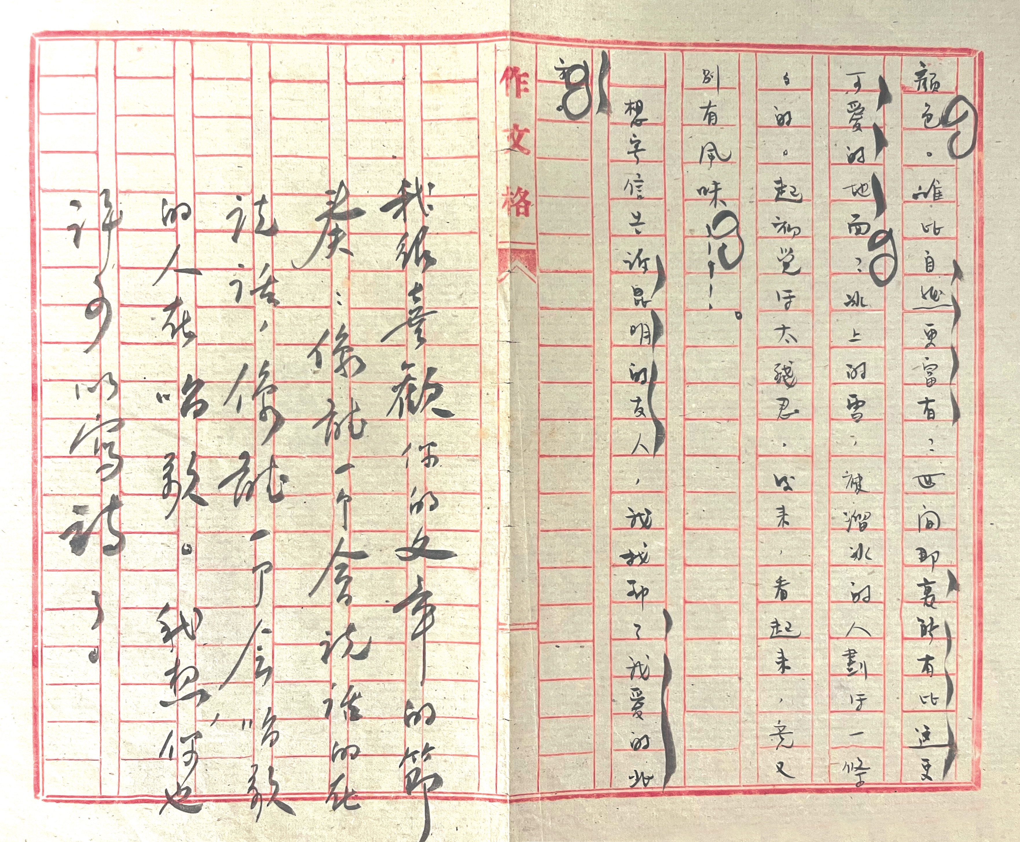 在《雪后》手稿首页的最右侧,竖行题写着五个字:“第一次作文”。想来是作文发下来后,宗璞先生在上面写的吧?