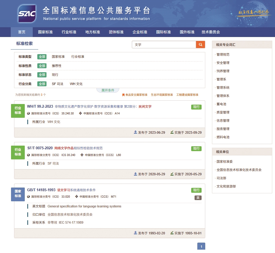 根据《国家标准化管理委员会 民政部关于印发〈团体标准管理规定〉的通知》以及国家关于团体标准管理的要求,国家市场监督管理总局、国家标准化管理委员会建立了“全国标准信息公共服务平台”,对我国国家、行业、地方、团体、企业等各类标准信息进行统一管理。其中,以“文学”为关键词,在平台中未检索到文学数据直接相关标准(见图1),在平台子页面“全国团体标准信息平台”中未检索到文学数据直接相关标准,从全国统一的发布渠道来看,《文学数据管理与应用总体要求》团体标准是全国首个界定文学数据领域的标准。目前,《文学数据管理与应用总体要求》团体标准已在“全国团体标准信息平台”登记(见图2)。